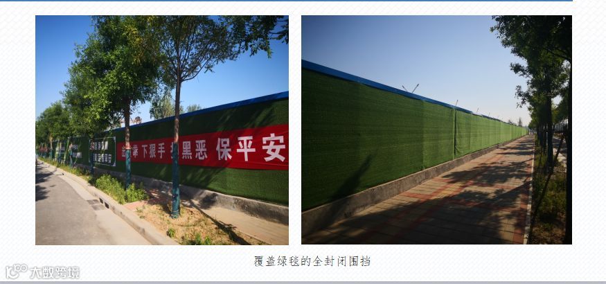 施工现场按平面布置图要求做好了主要道路、材料堆放、生活区、办公区域铺设混凝土路面工作,实行场地的硬化或绿化处理,确保无一处露土现象,达到防尘控制要求。
