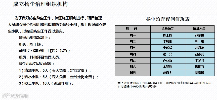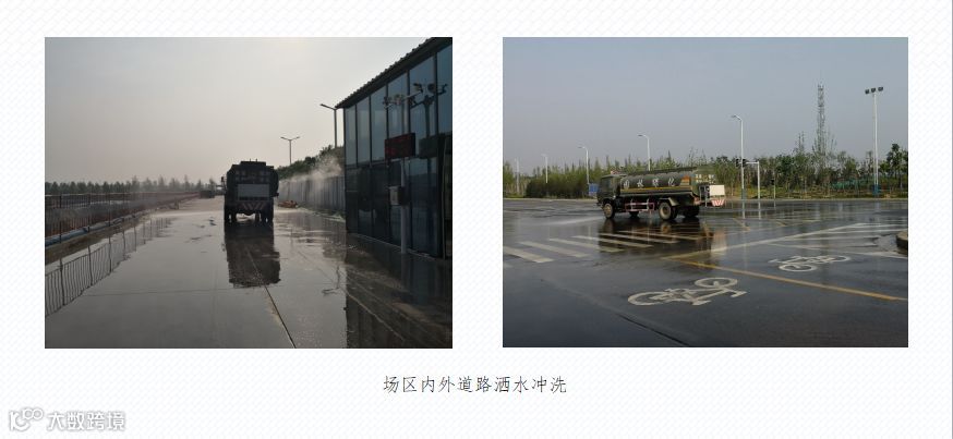 在施工现场主要道路、生活区的适当位置安装喷淋设施、水龙头等。安排专人每日对施工现场的道路进行清扫,清扫前需进行洒水湿润,每两个小时洒水一次,保持路面湿润。
