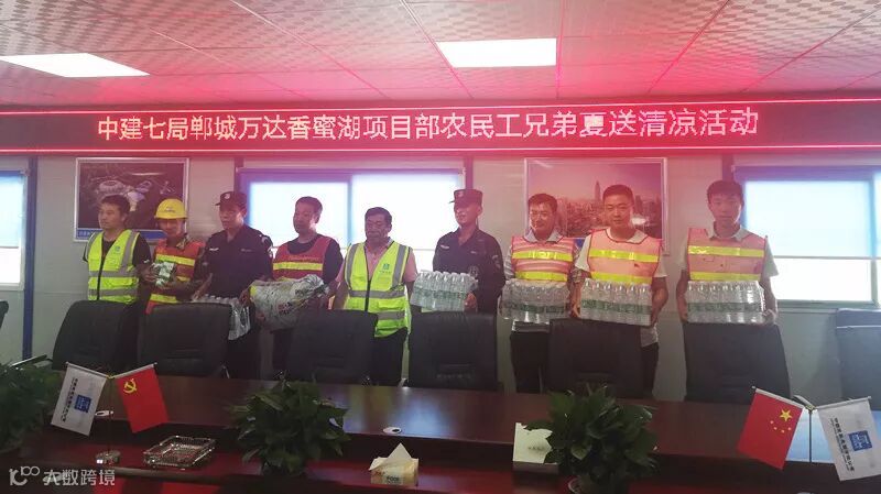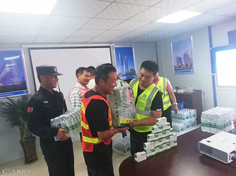 项目部为应对高温天气,保工期,抓进度,组织管理人员为农民工夏送清凉发放绿豆,矿泉水、藿香正气液等防暑用品。