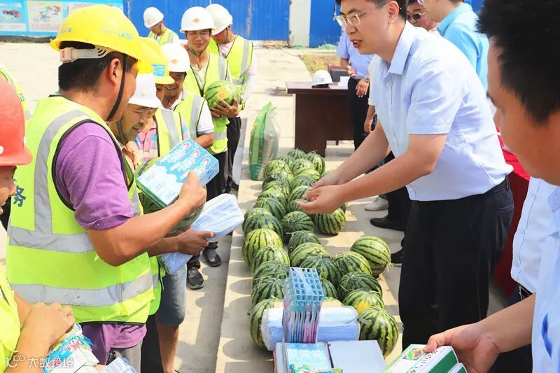中原分公司党委副书记、纪委书记、工会主席李阳、项目生产经理仝宇锋、总工程师崔永伟等为广大劳务工人发放了藿香正气水和绿豆等防暑降温药品和食品。