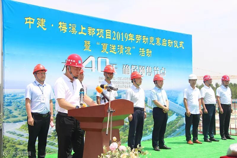 中建·梅溪上郡项目部举办了“大干40天,确保预售节点”劳动竞赛启动仪式,总承包公司总经理王宇光、党委副书记、工会主席李向阳等人出席并讲话,并为一线工人送上了水、毛巾、花露水、西瓜、防暑药品等慰问品。