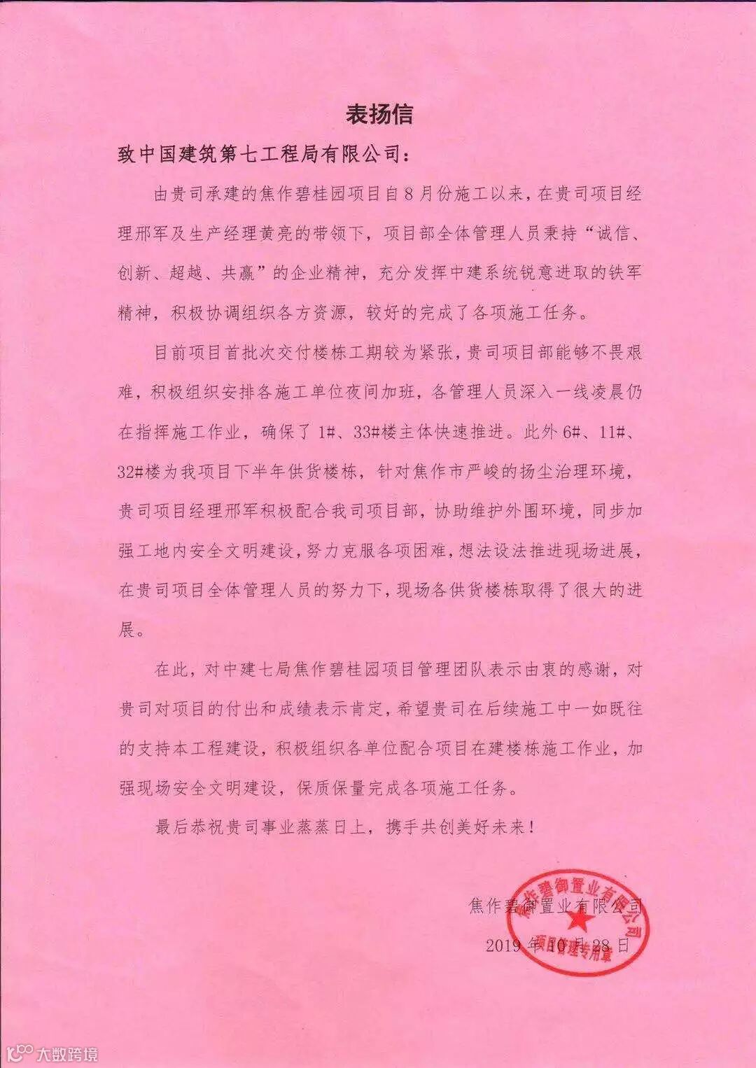 公司焦作碧桂园项目喜收表扬信