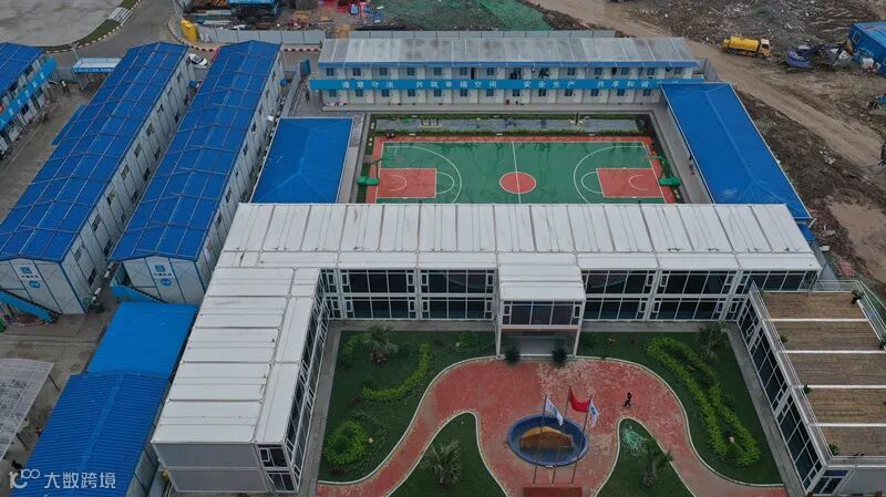 项目部的临建也均按照争创系统内CI金奖的高标准配置,办公区加装玻璃幕墙,生活区配备标准篮球场,同时均采用折叠式箱式房。