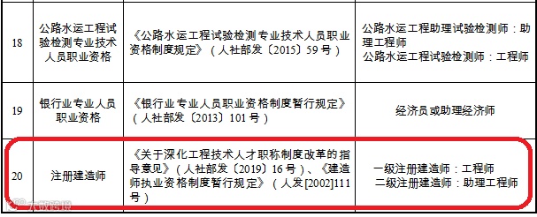 2019年1月,福建省人社厅印发《关于建立部分专业技术职业资格和职称对应关系的通知》: