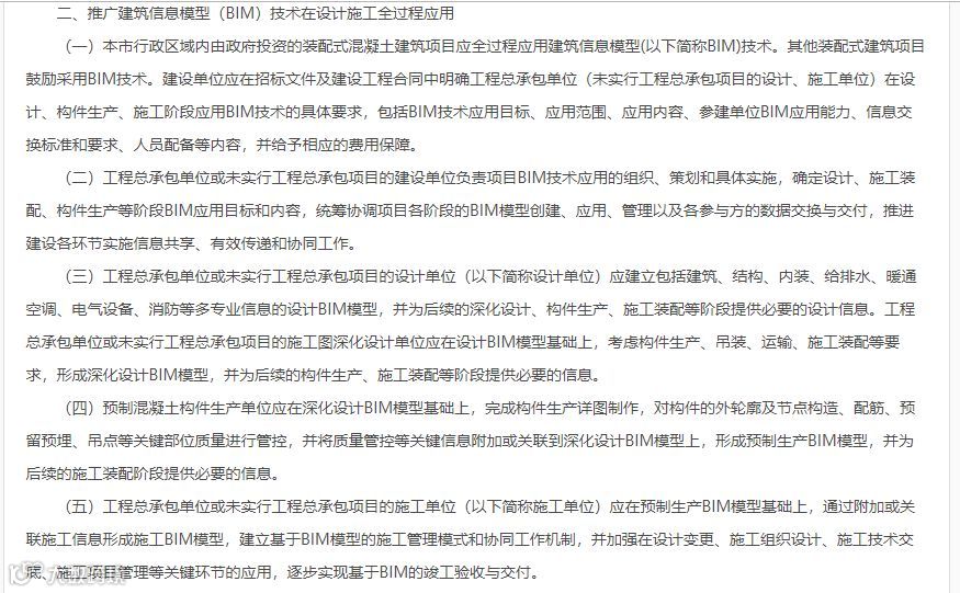 主要内容:推广建筑信息模型(BIM)技术 在设计施工全过程应用,本市行政区域内由政府投资的装配式混凝土建筑项目应全过程应用建筑信息模型(以下简称BIM)技术。其它装配式建筑项目鼓励采用BIM技术。工程总承包单位或未实行工程总承包项目的建设单位也要全面深化项目BIM技术应用。