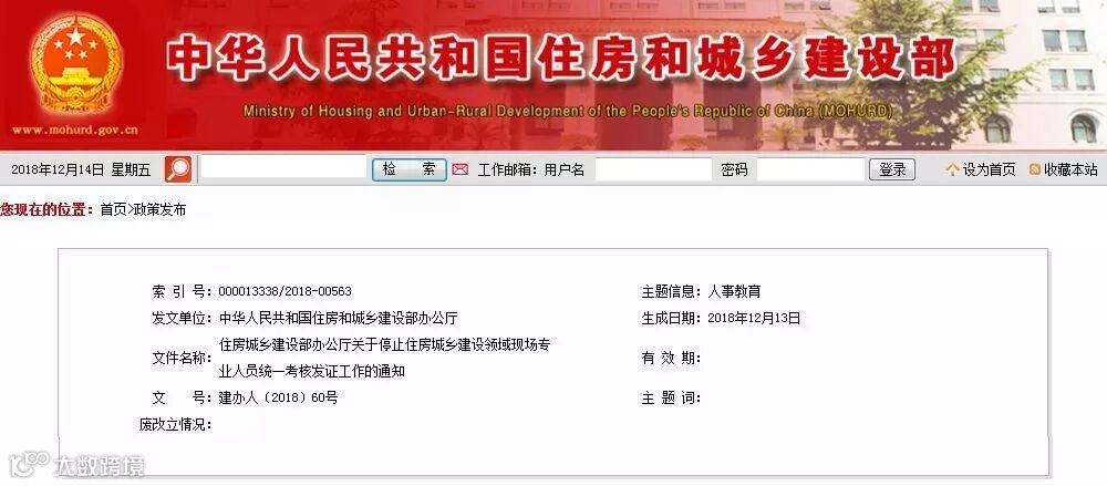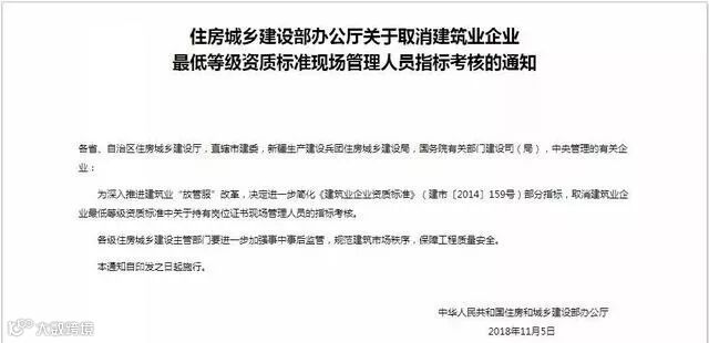 2018年11月14日住建部官网发布《关于取消建筑业企业最低等级资质标准现场管理人员指标考核的通知》(建办市〔2018〕53号)提出:决定进一步简化《建筑业企业资质标准》(建市〔2014〕159号)部分指标,取消建筑业企业最低等级资质标准中关于持有岗位证书现场管理人员的指标考核。