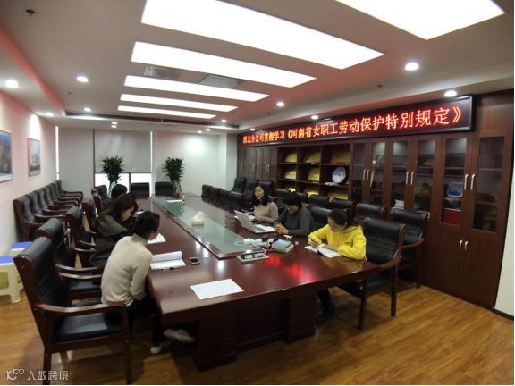 华中分公司机关工会组织分公司全体女职工在会议室学习了《河南省女职工劳动保护特别规定》。会上,机关工会主席朱晨同志对《女职工劳动保护特别规定》进行了全文宣读,对加强女职工劳动保护,不因女职工怀孕、生育、哺乳降低工资待遇,遵照执行女职工生育假、哺乳时间等条款进行了详细解读。