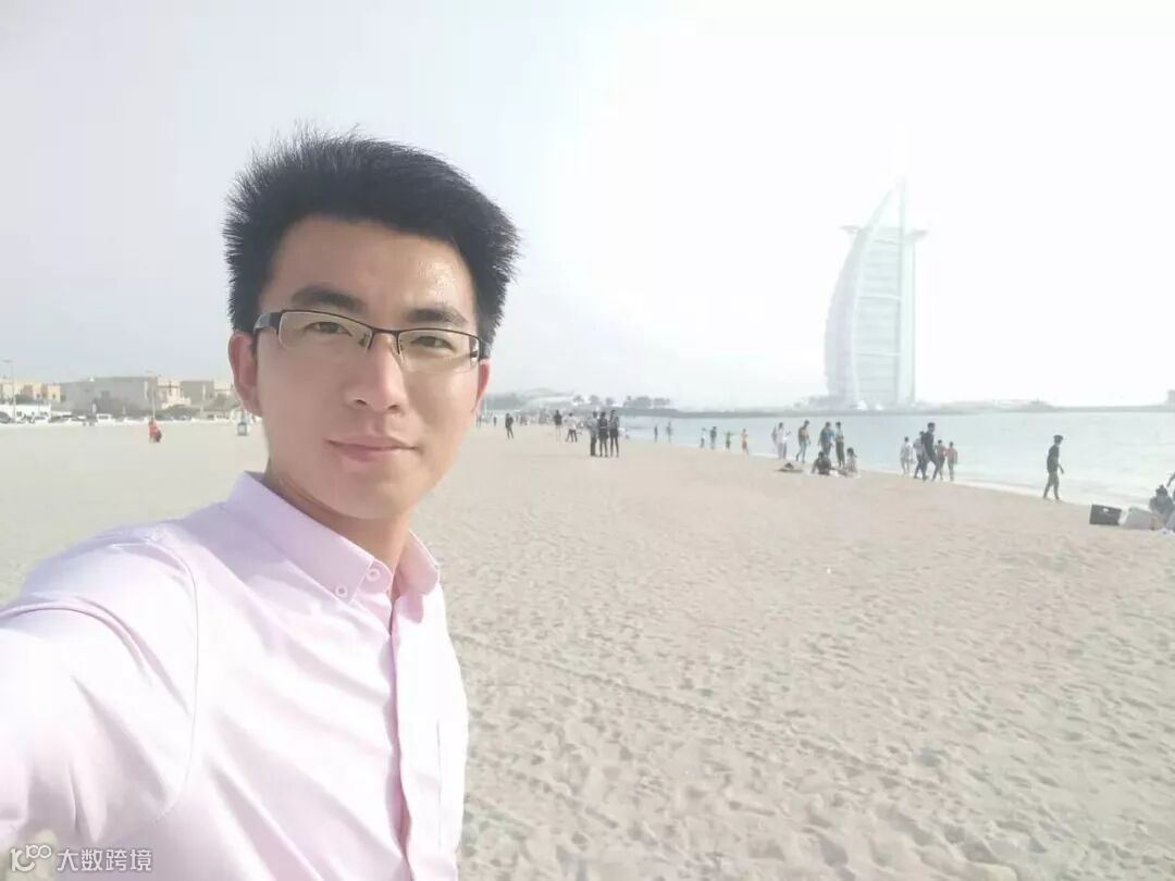 路李国在阿联酋的朱美拉公共海滩留影,远处是著名的帆船酒店