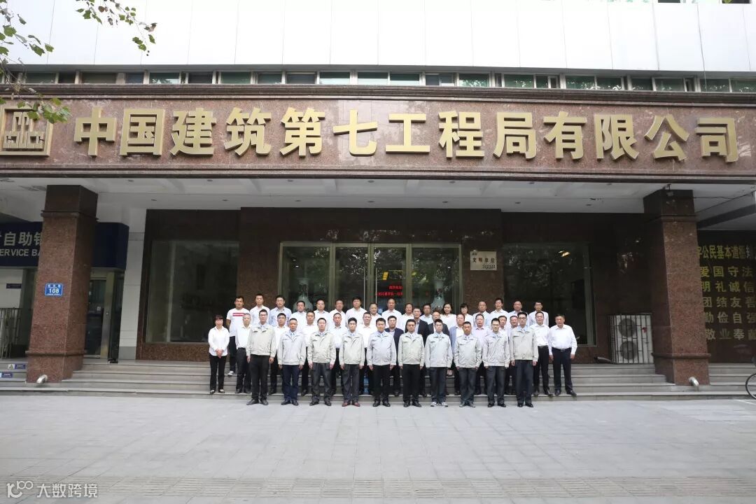 局副总经理尹大勇(左7)及公司领导班子等与首批出国人员在工程局办公大楼门前合影