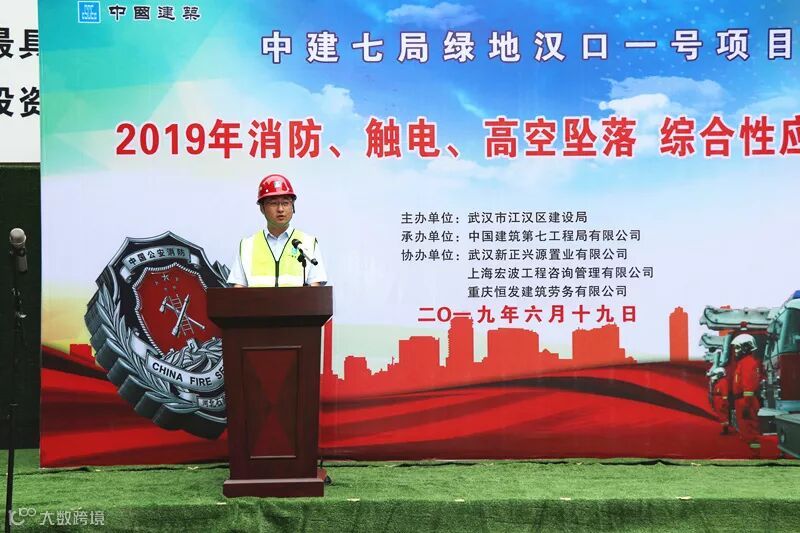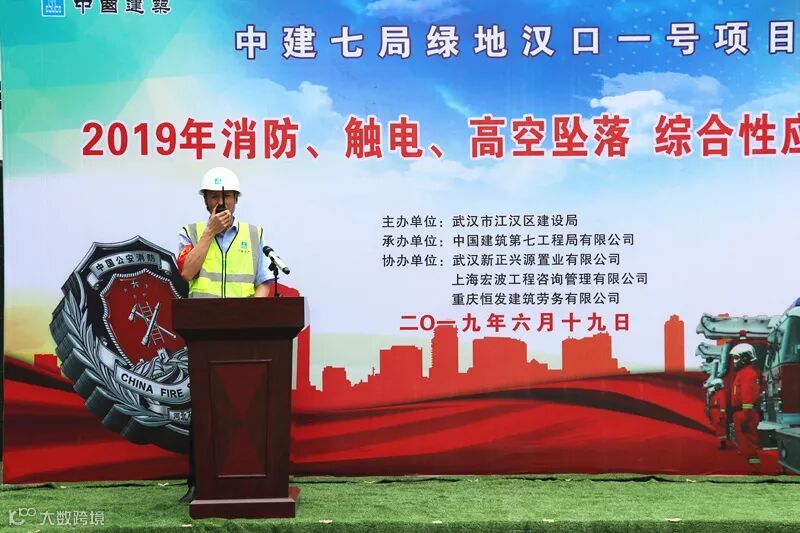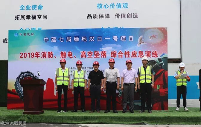 近日,武汉绿地汉口一号项目部举行以“防风险、除隐患、遏事故”为主题的消防、触电、高空坠落综合性应急演练活动,武汉市江汉区应急管理局副局长刘中华、江汉区建设局总工程师胡卫斌、华中分公司执行总经理师磊、副总经理柳振洋,绿地汉口一号项目总白仲安(甲方)、项目管理人员、监理方和劳务人员等共70余人参加了此次活动。