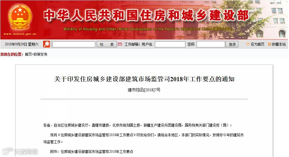 2018年3月20日,为打破垄断,防止市场垄断,严肃查处限制建筑企业跨省承揽业务的行为,住建部办公厅下发《关于开展建筑企业跨省承揽业务监督管理专项检查的通知》。