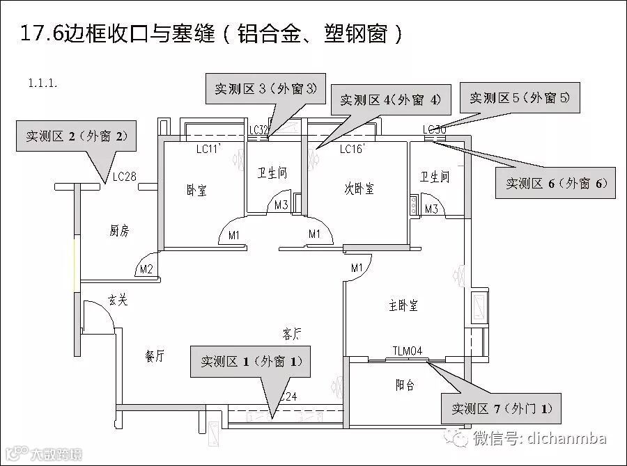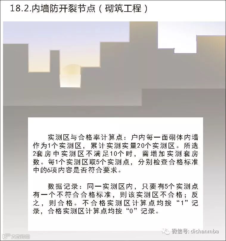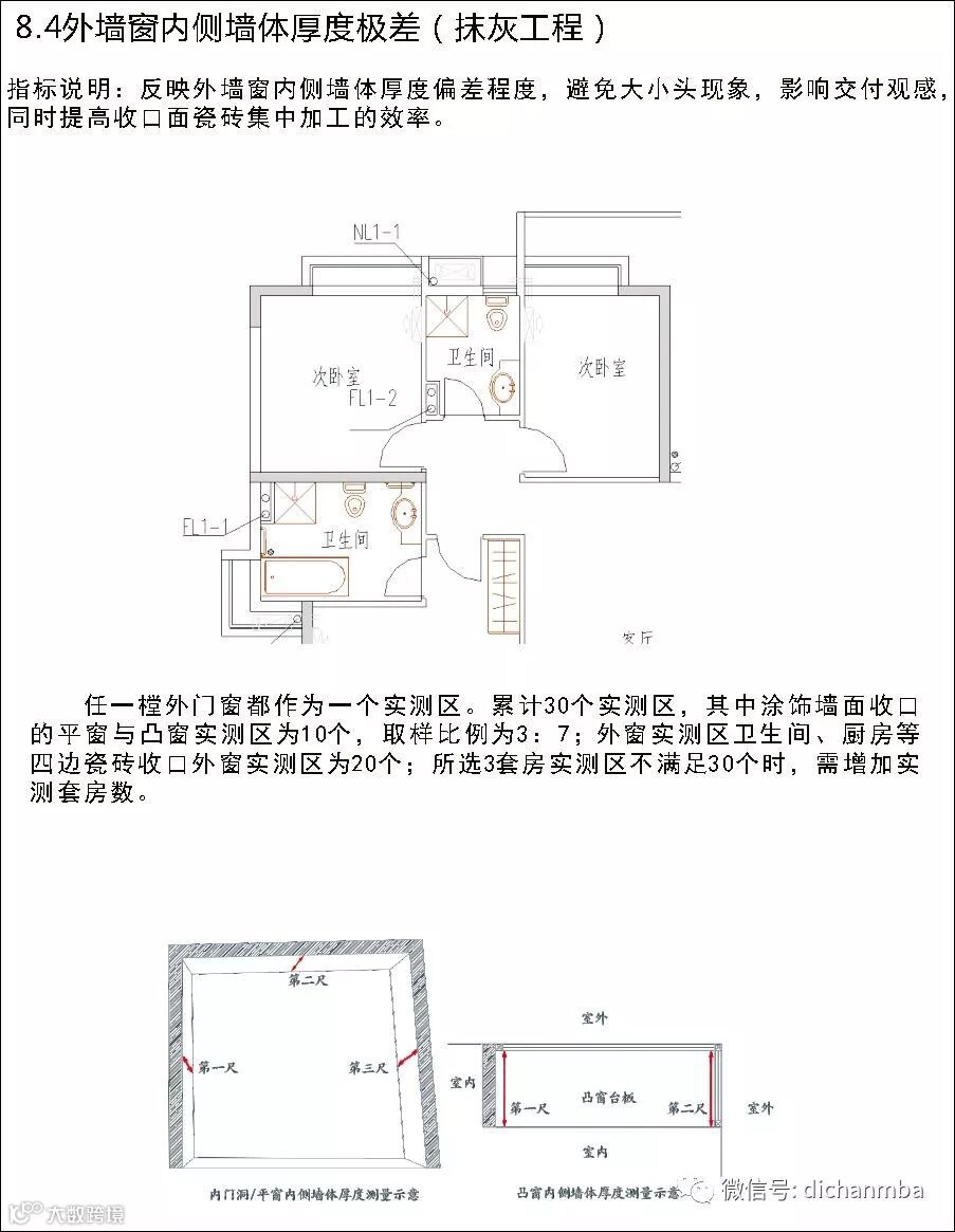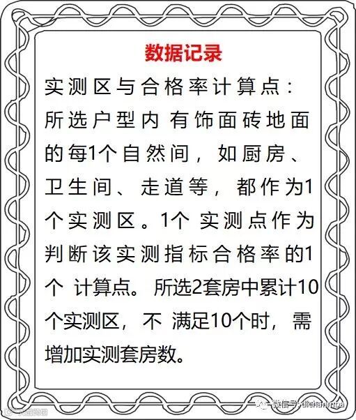 实测区与合格率计算点:所选户型内有饰面砖墙面的厨房、卫 生间等每一自然间作为1个实测区。所选套房内所有墙体全检。累计 实测实量10个实测区。1个实测区的实测值作为1个实测合格率计算 点。所选2套房的实测区不满足10个时,需增加实测套房数。