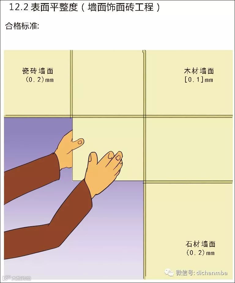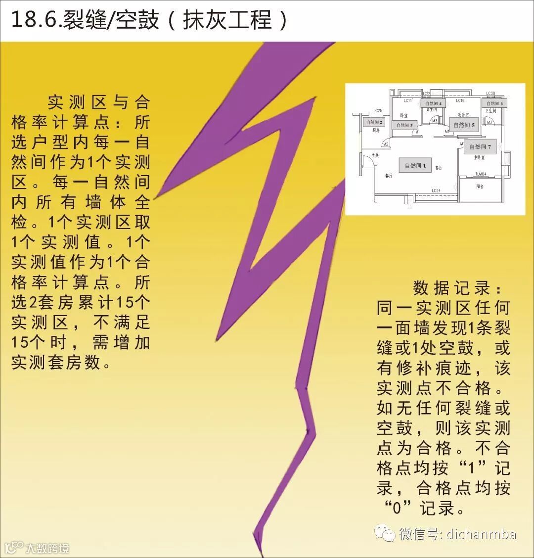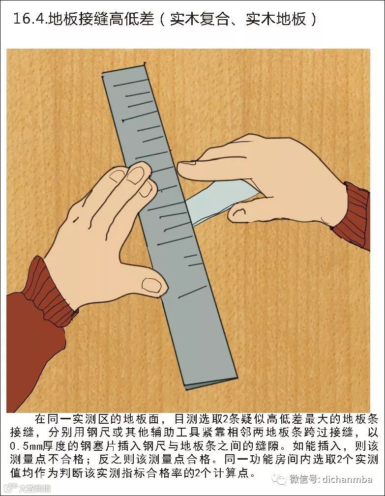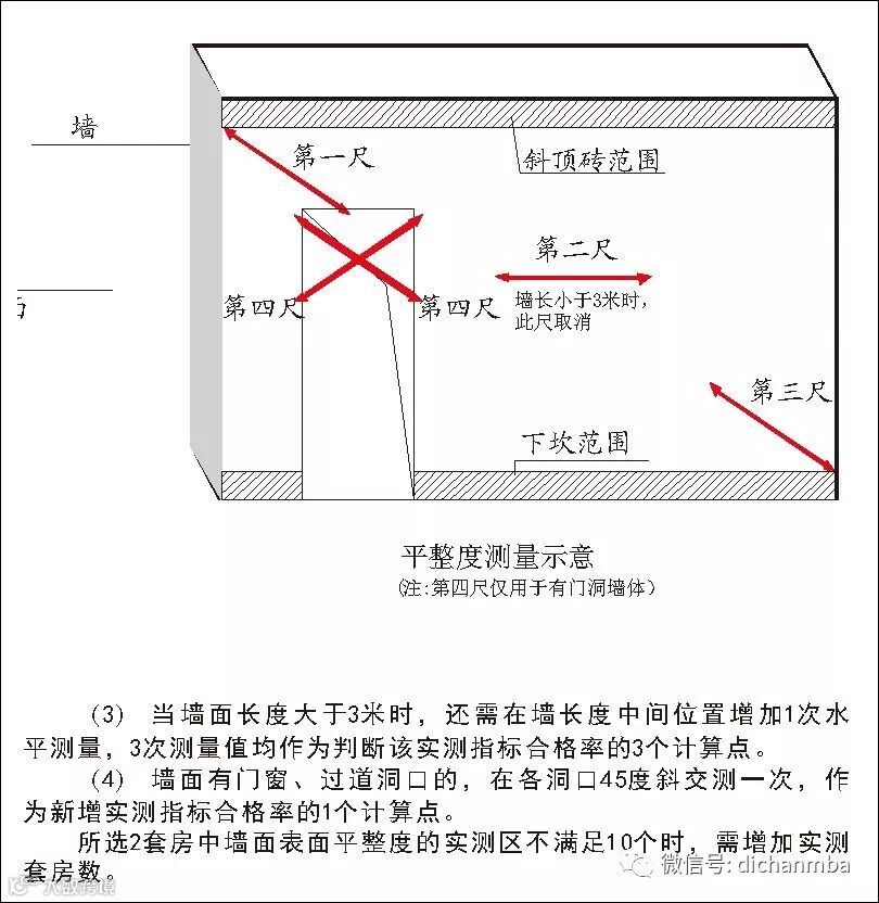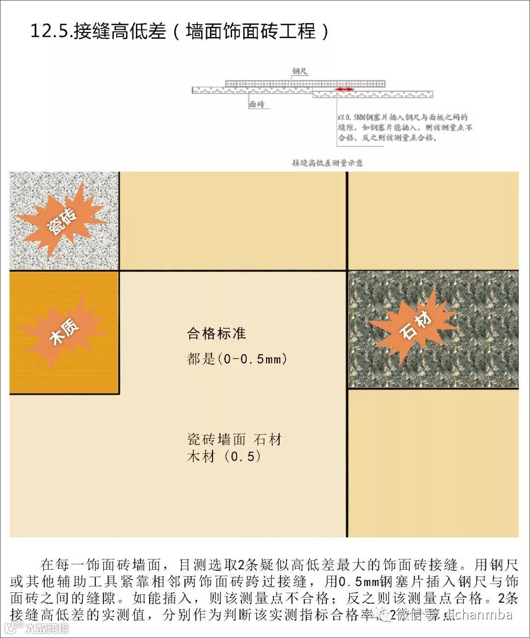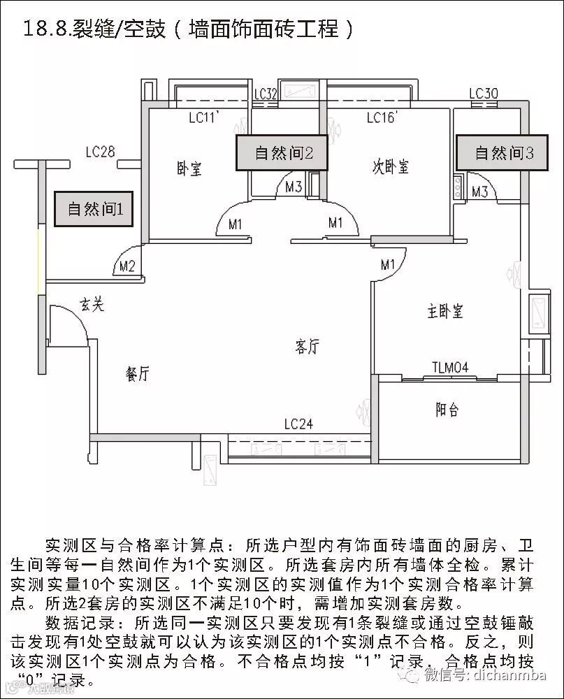 实测时,厨房和卫生间户内墙面测量部位需完成贴砖工程。同一实测区通过目测、空鼓锤敲击方式,检查是否符合合格标准。