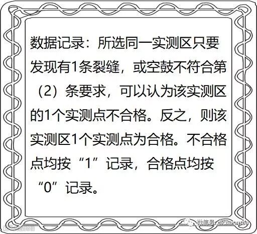 数据记录:所选同一实测区只要发现有1条裂缝或通过空鼓锤敲 击发现有1处空鼓就可以认为该实测区的1个实测点不合格。反之,则 该实测区1个实测点为合格。不合格点均按“1”记录,合格点均按 “0”记录。