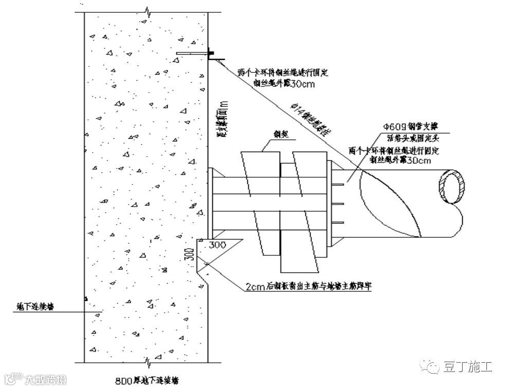 ◆每根钢管支撑实际采用两个牛腿,每个牛腿与地墙主筋的焊缝长度25cm,焊脚尺寸不小于1cm。