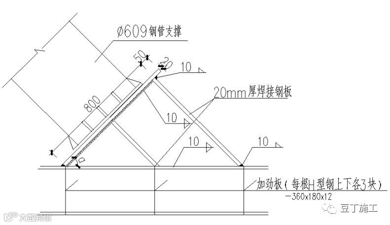 钢管支撑:采用φ609、壁厚16mm的钢管焊接制作,端头采用直径750mm钢法兰盘连接,管钢法兰盘厚度不小于20mm。