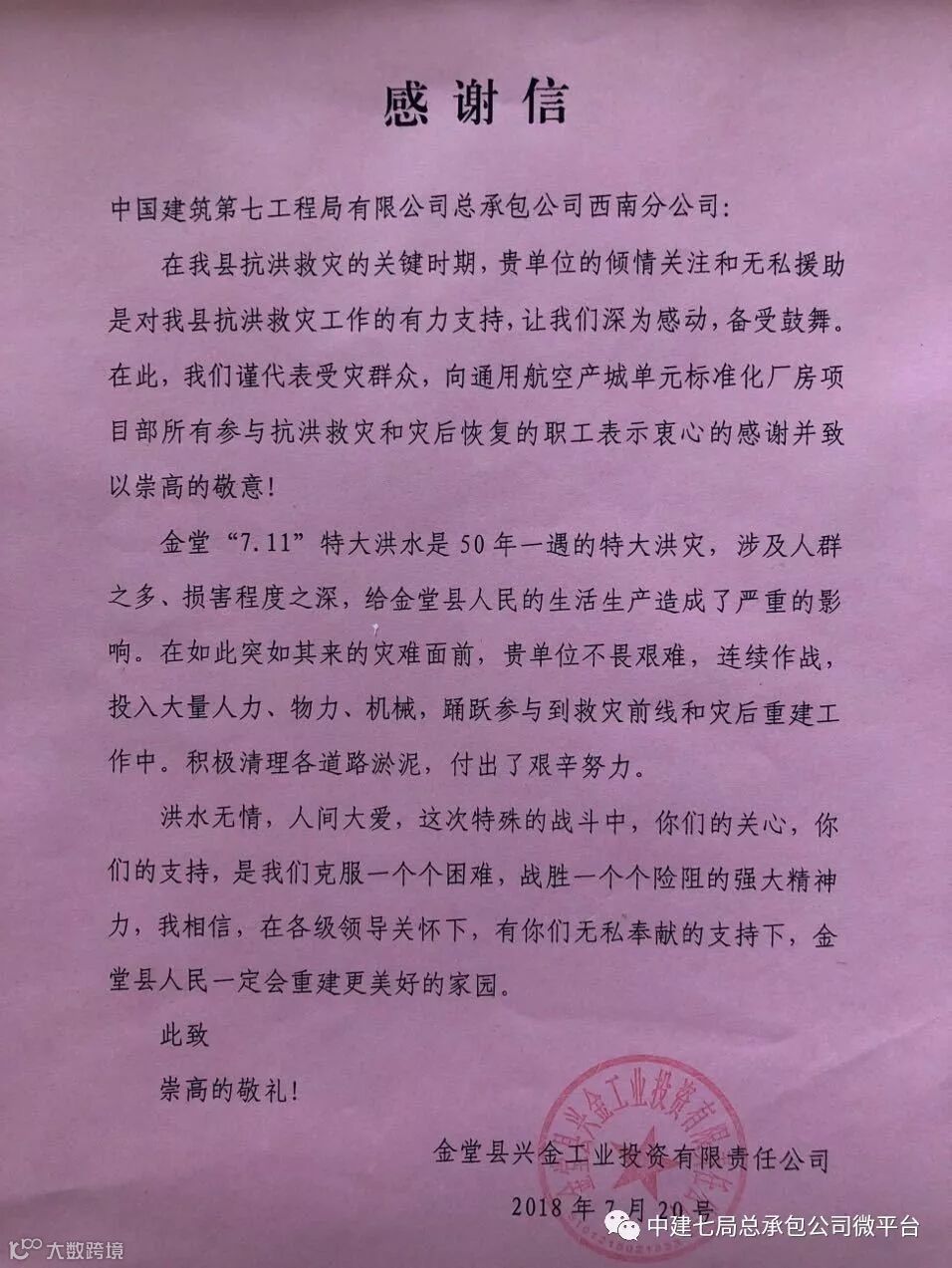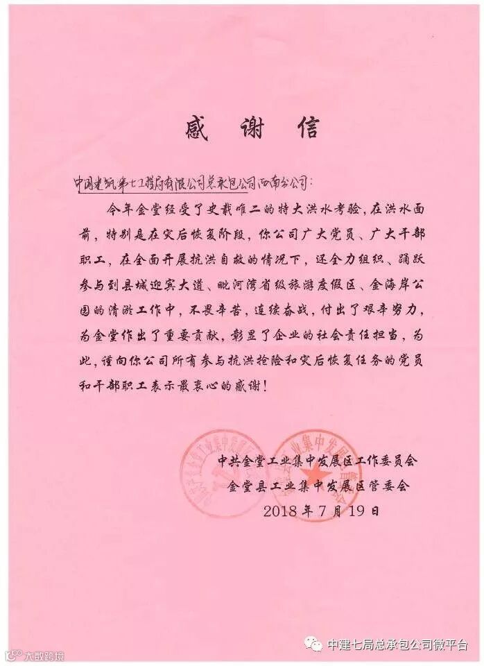近日,中建七局总承包公司西南分公司(以下简称西南分公司)陆续收到了金堂县工业集中发展区管委会和金堂县兴金工业投资有限公司的表扬信,信中提到的事情正是一个多月前发生在金堂县的那次难忘的抗洪抢险。