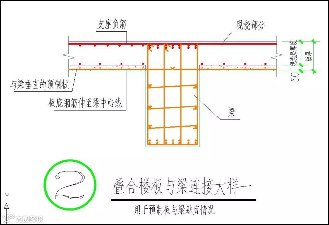 楼板上层钢筋应置于格构梁上弦钢筋上,与格构梁绑扎固定,以防止偏移和混凝土浇筑时上浮。