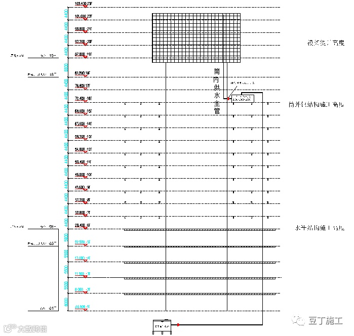 待核心筒外水平结构封顶后,立即进行83F水箱安装,此时,将全部的正式消防系统安装就位,整个塔楼全部使用正式的消防管道,并至工程竣工。