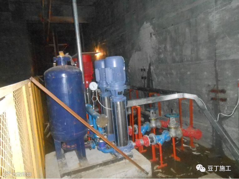 在塔楼每个设备层设置一个临时水箱,各临时水箱用水泵自下而上接力提升,待上层水箱安装完成后,拆除变频控制柜,给水变频泵改为给水提升泵,水泵采用高低液位浮球阀控制,保证各水箱始终有水,稳压泵随设备层水箱的安装施工提升。