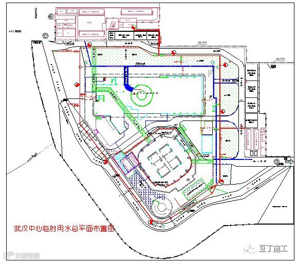 本工程拟现场平面、裙楼及地下室临时生产用水与室外消火栓用水共用管道。塔楼、裙楼及地下室、室外消火栓及生活用水分别单独进行用水设计,三个系统独立使用。