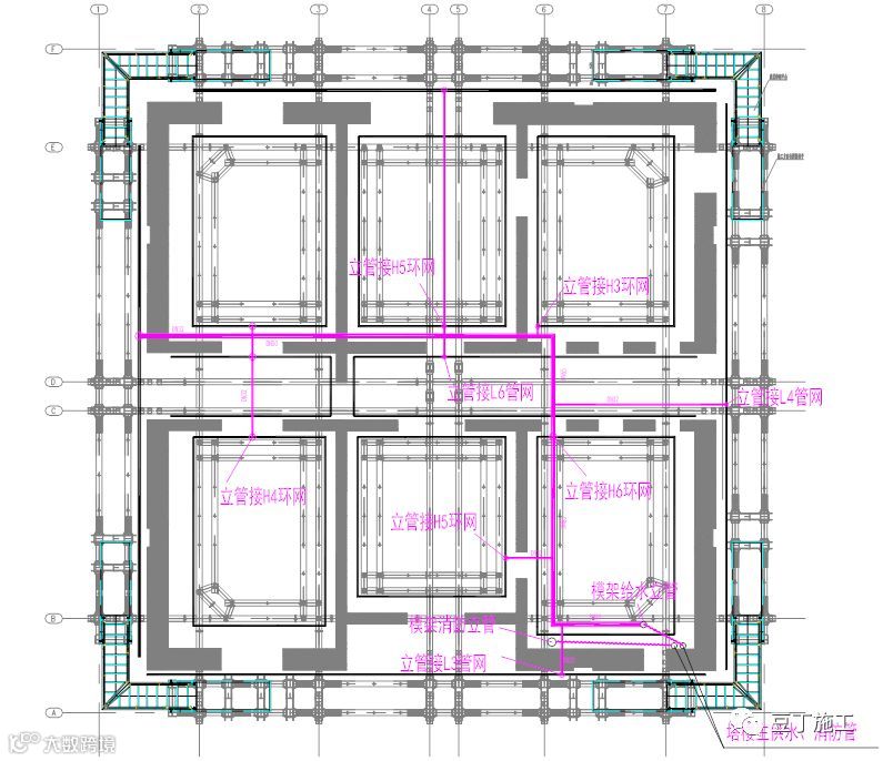 (2)塔楼立管位置的选择应避免占用管井、风井及电梯井等井道,一面影响后期的正式管道施工,立管可以尽量与甭管等安装在一起。水平管道也不宜布置在后期正式管道较为密集的区域。