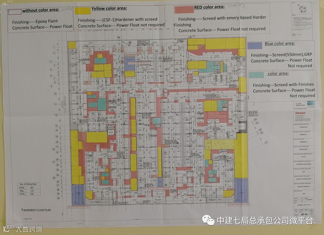 施工每一个阶段的图纸都会粘贴在相应的墙上,不同区域按照施工工艺和使用材料的不同,用相应的颜色覆盖,每种颜色都有相应的标注,使工作人员一目了然。