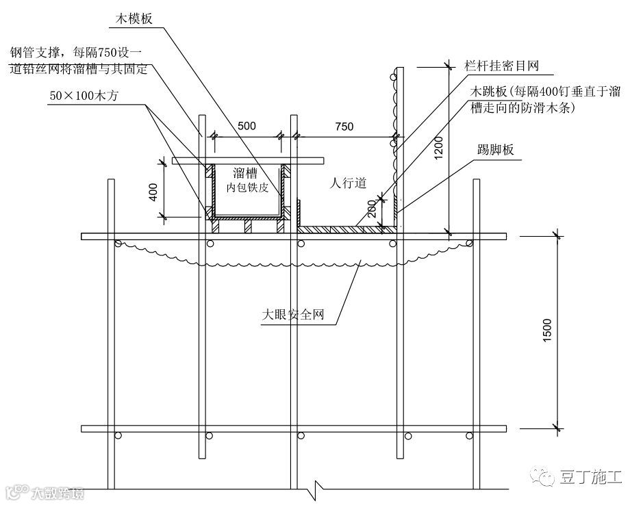 溜槽上口采用 50×100mm 木方固定,木方间距为 1000mm,溜槽底部每隔2000mm 设置横向木方卡在水平钢管上,防止溜槽下滑。