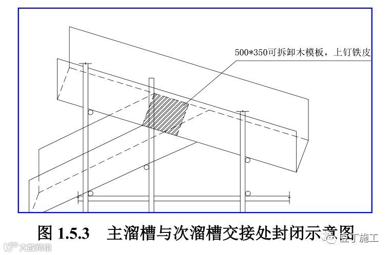 将主溜槽与次溜槽交接处的活动封板封闭,防止混凝土流入次溜槽,具体见下图。