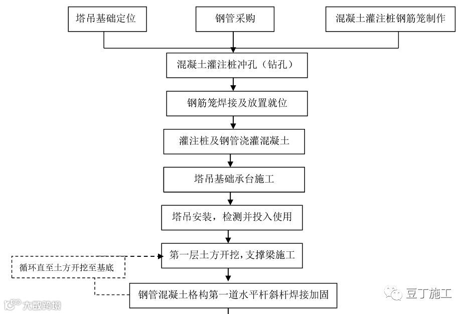 随着建筑业的不断发展,以及施工工艺的进步,超高层钢结构工程的增多,要求塔吊的起重量越来越大,塔吊的选型也朝大型方向发展,这对塔吊基础设计提出了更高的要求。传统的塔吊基础形式不利于深基坑施工,而近几年出现的角钢格构式塔吊基础虽适用于深基坑,但刚度较弱,不适用于大型塔吊。本技术采用的钢管混凝土格构式高桩承台塔吊基础施工技术,塔吊基础的安全性比角钢格构式塔吊基础更佳且施工也更加方便。大型塔吊可以在土方开挖之前进行安装,便于塔吊提前投入使用,不仅为土方开挖、基坑支护结构施工及混凝土底板浇筑提供了垂直和水平运输的机械,从而大大节省工期、提高工效。