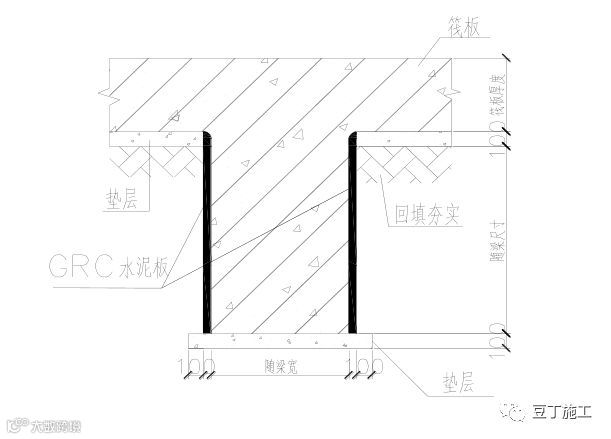 水泥板加工时考虑到防水的抹灰,要做成圆角,所以水泥板加工单在提计划时可设置为高度比梁高度低 20mm;也可以把地梁、承台水泥板与筏板垫层交接处阴阳角抹灰成圆角。水泥板顶端亦可以用打磨机打磨成圆角,避免对防水层的破坏。