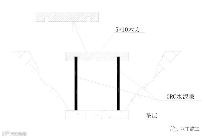 水泥板运输到工地采用塔吊吊装到基坑内,选择较平整部位放置,根据尺寸大小可以人工抬置施工部位进行安装,在开挖好的梁及承台体侧面嵌入大头木楔并拉线找直,把 GRC 水泥模板贴紧,梁及承台侧面木楔用大钉子加固。如梁及承台自身截面尺寸过大、过高,可用木方进行内支撑或外加固;在梁及承台连接的地方,水泥板可以根据现场需要切割成符合要求的尺寸。水泥板衔接时要严丝合缝,可在侧面用木方连接加固在一起,测其垂直度要符合要求,见下图。