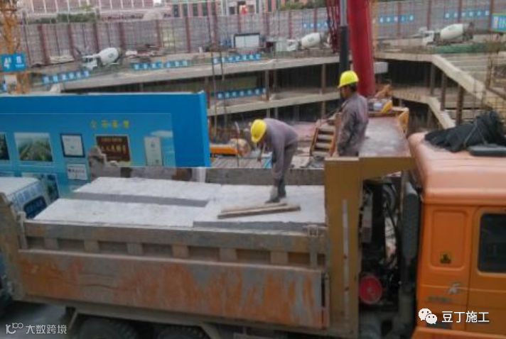 为了比较快捷地完成切割留下的水泥浆的清运,可以增加人工数量进行装运,并安排 3-6 个 1.5m 3 容量的料斗,塔吊配合垂直运输和装车。一般采用叉车转运砼块的楼地面均铺上麻袋或土工布,清理时将养护用材料清理干净即可。