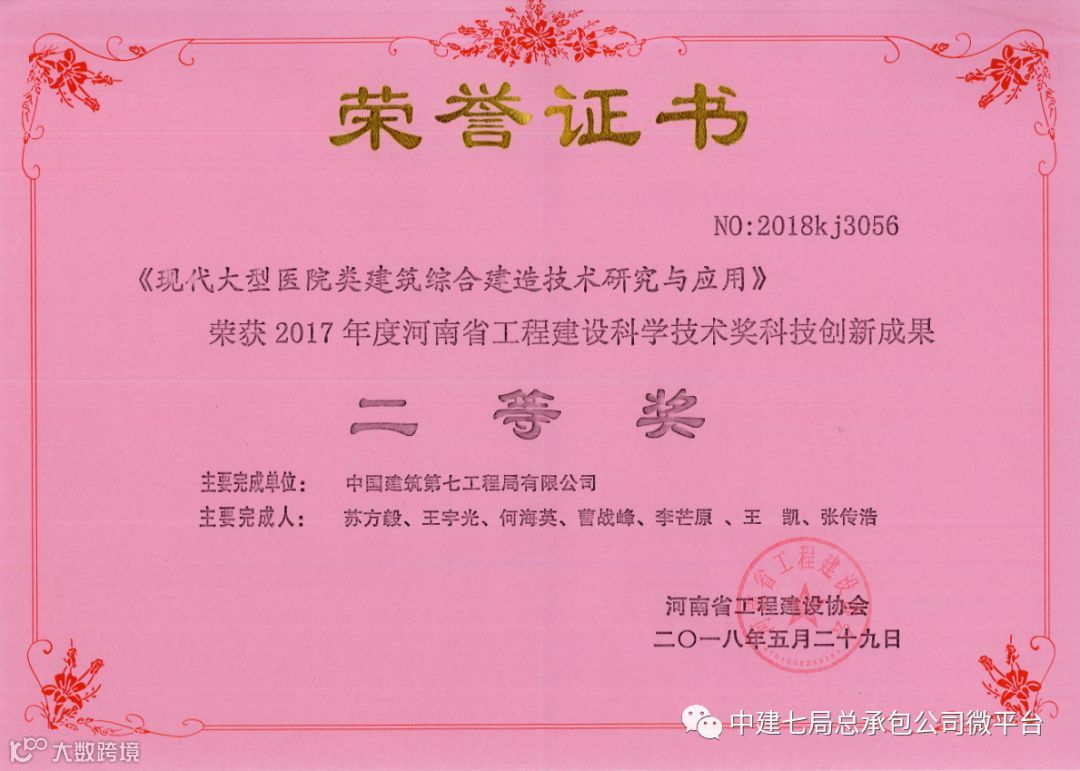 公司编制的《现代大型医院类建筑综合建造技术研究与应用》经工程建设协会组织专家评审,评审委员会审定,在2017年度河南省工程建设科学技术奖评审工作中荣获河南省工程建设科学技术奖科技创新成果二等奖。该项成果总结公司近年来医院类项目的施工经验,从现代大型医院类建筑工程综合设计技术研究、土建工程施工技术研究、机电安装工程施工技术研究以及现代大型医院类建筑特有的专业工程施工技术研究等四个方面阐释,形成一套现代大型医院类建筑的综合设计及建造技术,为行业类似工程提供借鉴。