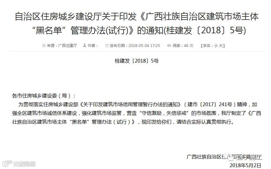 叁丨《广西壮族自治区建筑市场主体“黑名单”管理办法(试行)》开始实施