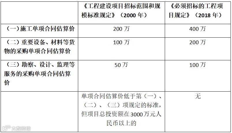 与2000年开始施行的《工程建设项目招标范围和规模标准规定》相比,必须招标的项目施工单项合同估算价从200万提至400万,重要设备、材料等货物的采购,单项合同估算价从100万提至200万,勘察、设计、监理等服务的采购,单项合同估算价在则从50万提至100万元人民币,并且取消了原规定中“单项合同估算价低于第(一)、(二)、(三)项规定的标准,但项目总投资额在3000万元人民币以上的”这一要求。
