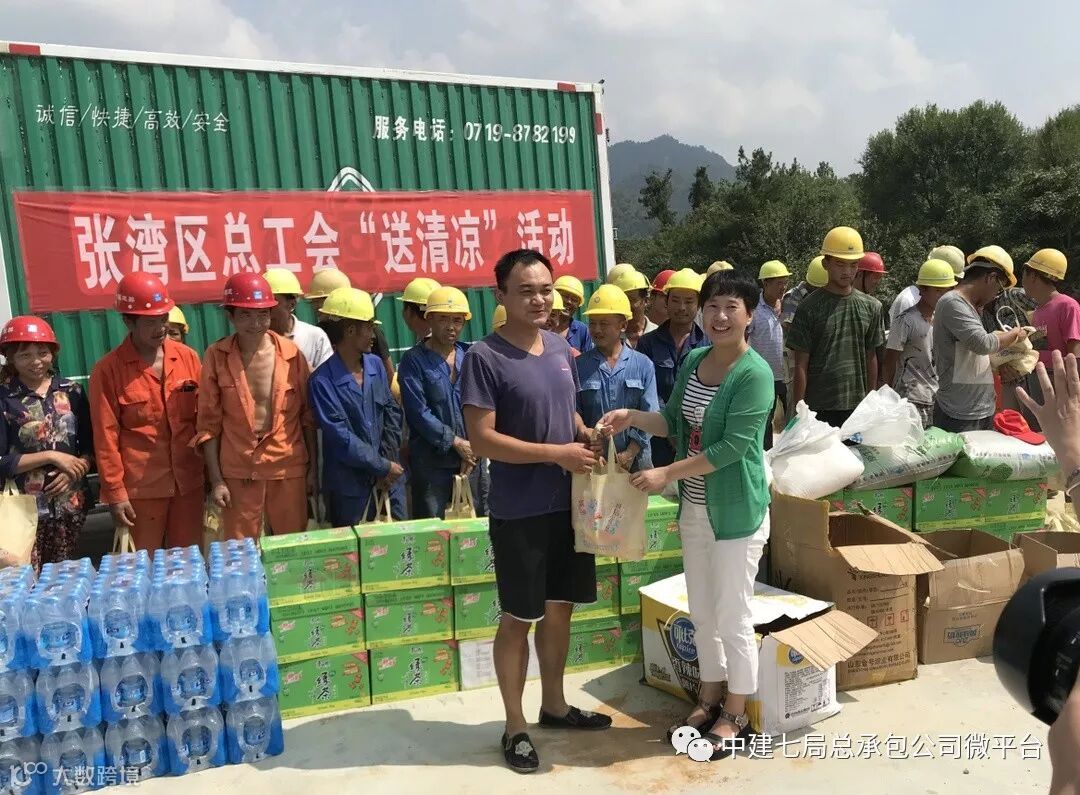 7月23日,十堰西城大道项目部工会联合十堰市张湾区总工会、十堰市张湾区住建局工会,开展“关爱农民工,夏日送清凉”活动,张湾区总工会常务副主席夏玉一行人由项目工会主席郑卫星陪同到施工现场慰问一线工人。此次“送清凉”活动,为一线工人送来矿泉水、绿豆、西瓜、藿香正气水等物品,还为工人宣传防暑知识和应对措施,切实保障一线工人的安全健康。