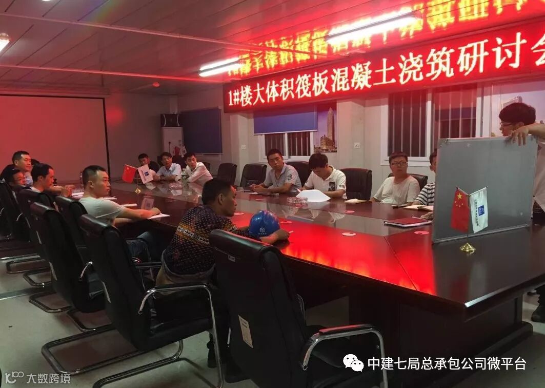 为确保顺利完成浇筑,5月19日,项目部组织管理人员、甲方、监理、劳务班组、商砼负责人召开了大体积混凝土浇筑专项研讨会,确定了浇筑方案,明确各单位负责事项;21日下午6点,项目部再次召开了动员大会,对本次浇筑的现场管理事项及人员分工进行了详细的交底。