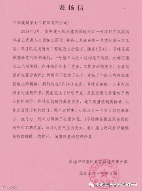 因为绿地汉口一号项目的突出表现,绿地控股集团武汉房地产事业部特意发来了感谢信,对项目部进行了表扬!