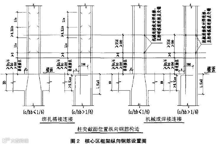 但对截面尺寸变化的框架柱,不仅要注意核心区框架柱箍筋的加密设置,同时还应控制好变截面框架柱纵向钢筋的构造处理,根据《混凝土结构设计规范》 GB50010-2002和《砼结构施工图平面整体表示方法制图规则和构造详图》03G101-1的要求,框架柱钢筋在梁柱核心区的布置应能满足下图所示 要求: