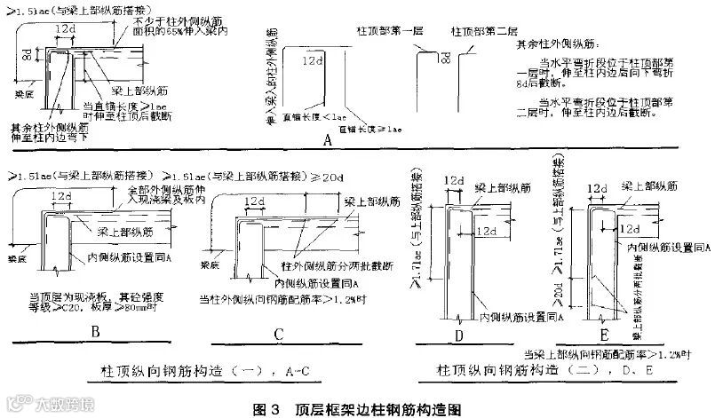 根据《混凝土结构设计规范》GB50010-2002和《混凝土结构施工图平面整体表示方法制图规则和构造详图》03G101-1的要求,框架结构体系中顶层混凝土框架柱边柱钢筋的构造应能满足下图所示构造要求: