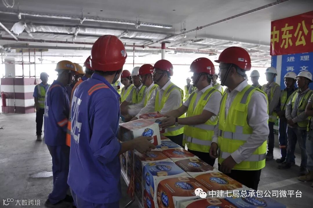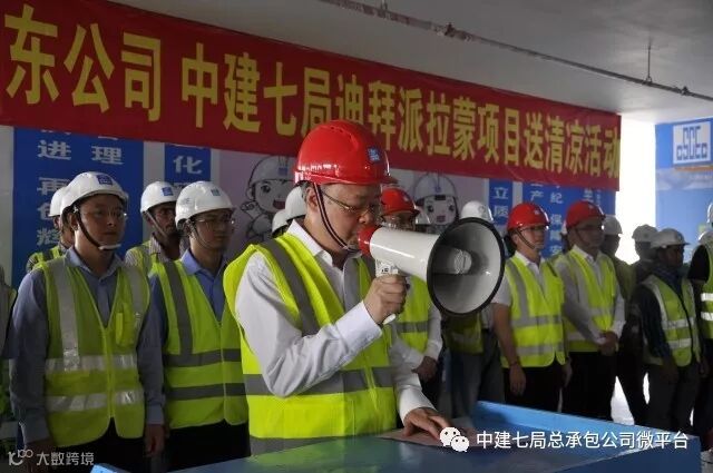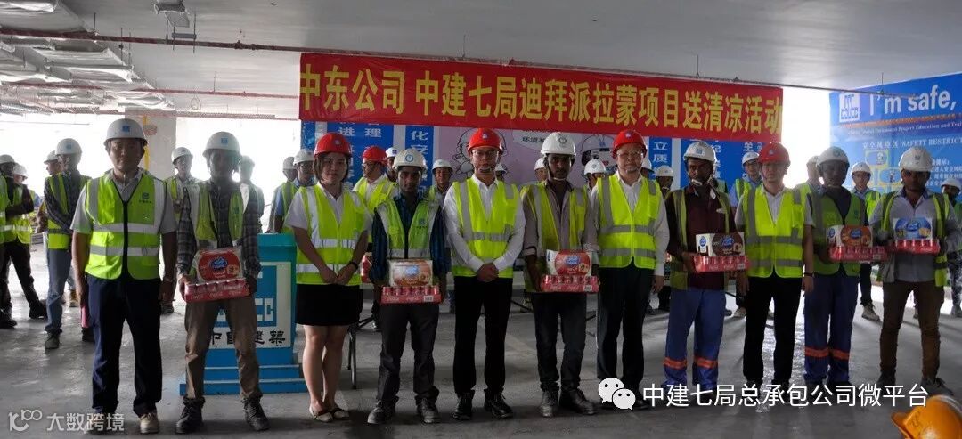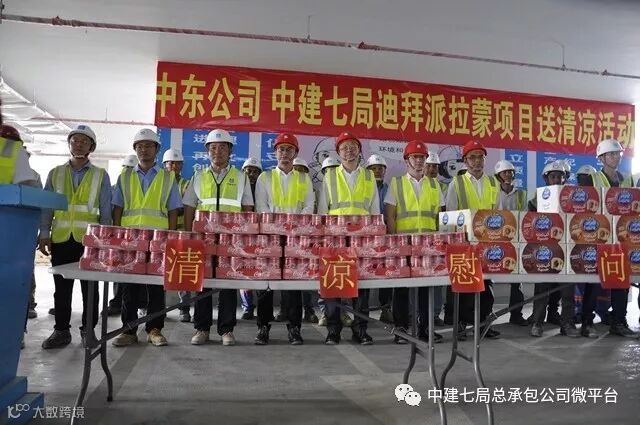 烈日当空,骄阳似火。进入8月,阿联酋的气温逐步开启烧烤模式,白天最高气温普遍45℃以上。为切实做好防暑降温工作,维护一线工人的安全与健康,8月1日下午,迪拜派拉蒙酒店项目开展了送清凉慰问活动。局党委副书记、工会主席丁建民,海外事业部副总经理高洪刚,公司副总经理寇小勇等出席了活动,中建七局中东办事处副主任高玉春等陪同,活动由公司团委书记、工会工作部部长李嘉佳主持。