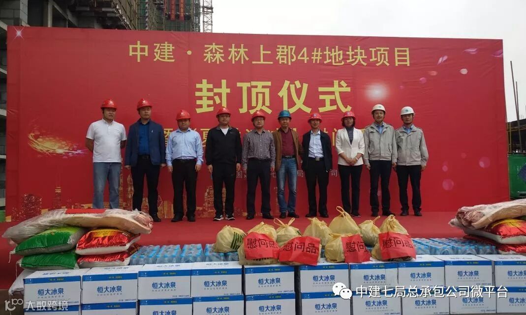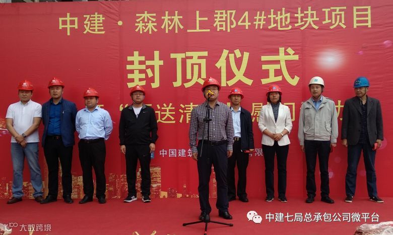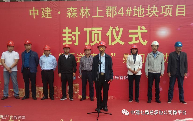仪式上,张新代表施工方讲话,他指出大楼主体全部封顶,取得了阶段性的胜利,在后续的施工中,4号地块将继续发扬中建七局“诚信、创新、超越、共赢”的企业精神,坚持“方案先行、样板引路、过程跟踪、严格验评、一次成优”的管理思路,以标准化管理为手段,严格按照质量标准进行过程控制,实现中建七局“拓展幸福空间”的企业使命。