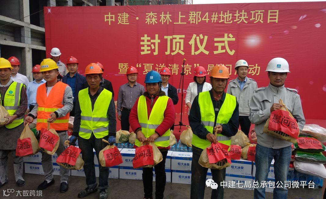 近日,中建·森林上郡4号地块举行了2#楼主体封顶仪式暨夏送清凉活动。郑州中建大观置业有限公司总经理王金刚,郑州高新建设监理咨询有限公司总监赵国效 ,公司调研员张新,助理总经理、副总工程师兼工程部经理何海英,4号地块项目经理徐旭,4号地块全体管理人员,劳务公司的部分管理人员和劳务工人代表共计100余人参加了仪式。仪式由项目总工苏凯主持。