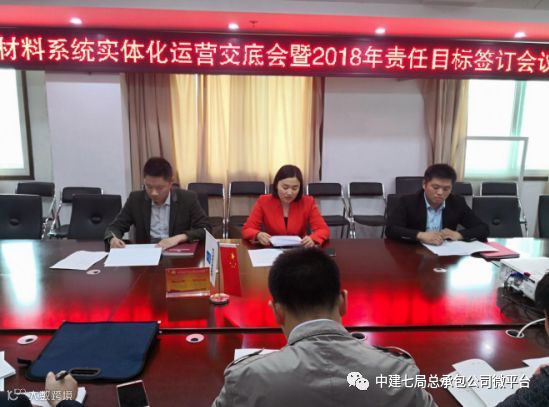4月24日下午,总承包公司分公司材料系统实体化运营交底会暨2018年目标责任书签订仪式在公司6楼会议室举行。公司副总经理田振涛、材料设备部经理郑君,副经理贾普兵、副经理蒋勋及各分公司材料设备部经理参加。会议由贾普兵主持。