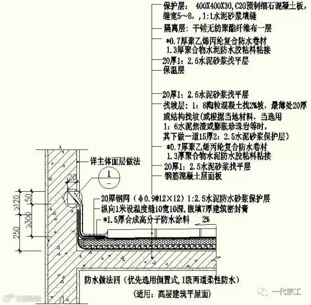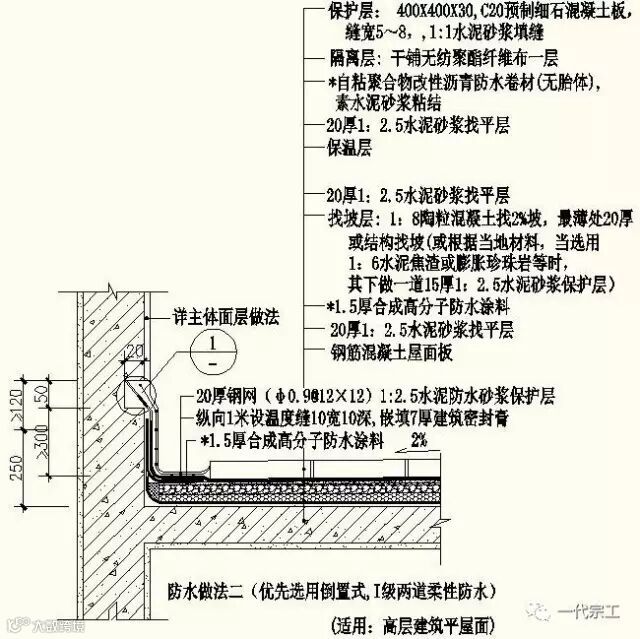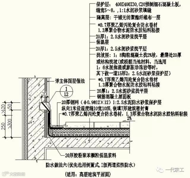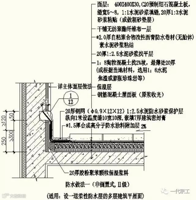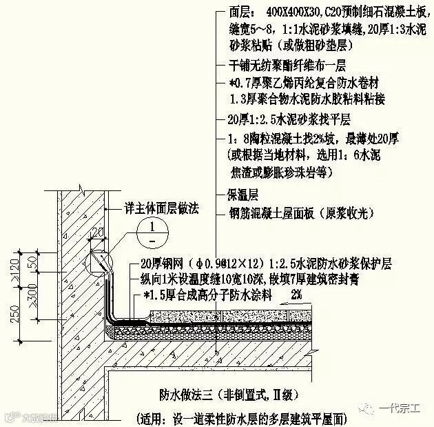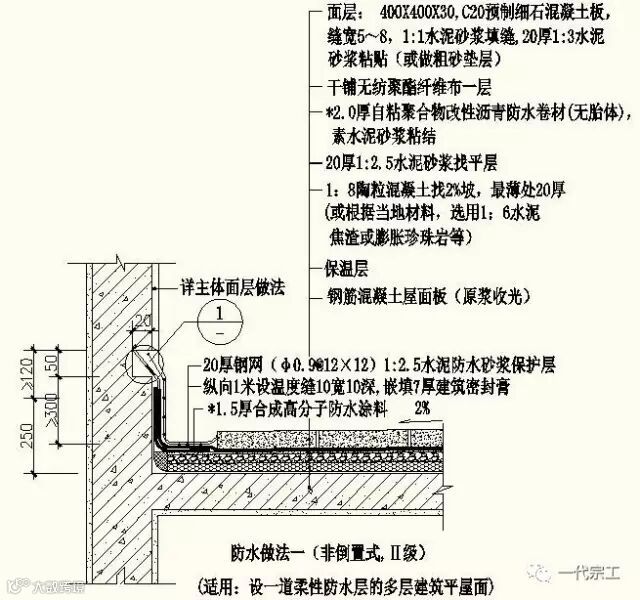 1、屋面防水做法一(非倒置式,Ⅱ级,适用:设一道柔性防水多层建筑平屋面)