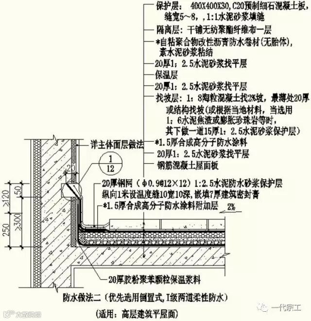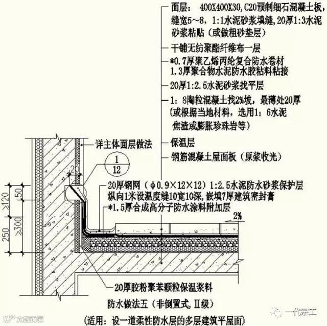 1、屋面防水做法一(非倒置式,Ⅱ级,适用:设一道柔性防水层的多层建筑平屋面)