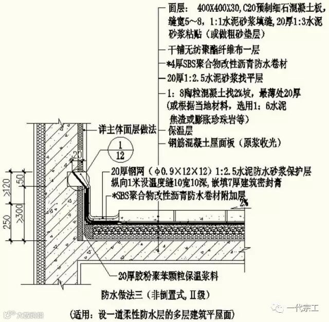 3、屋面防水做法三(非倒置式,Ⅱ级,适用:设一道柔性防水多层建筑平屋面)