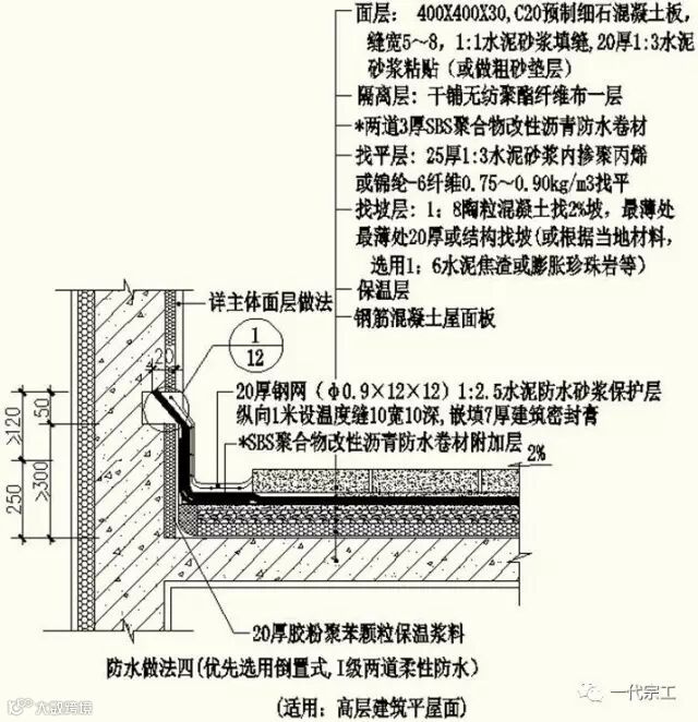 4、屋面防水做法四(优先选用倒置式,Ⅰ级两道柔性防水;适用:高层建筑平屋面,在北方温差较大地区及冬季5度以下施工时使用)