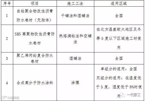 2、屋面的保温层和防水层严禁在雨天、雪天和五级风及其以上时施工。屋面防水层施工工法和适用区域要求如下表: